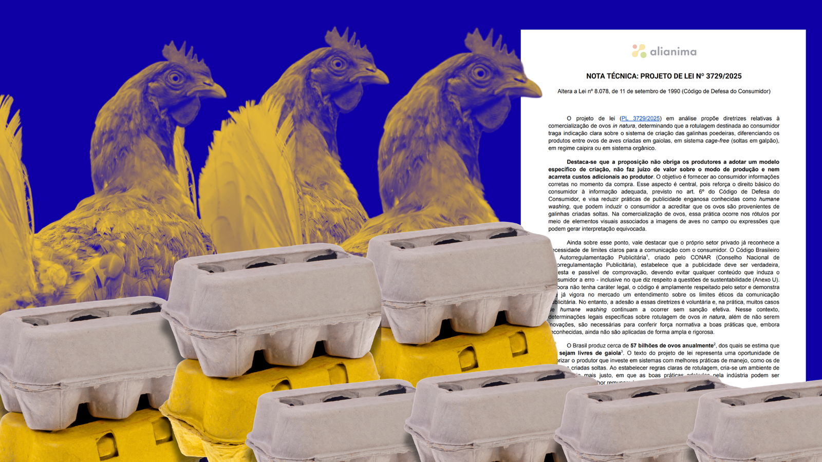 A Alianima enviou à Câmara dos Deputados uma Nota Técnica sobre o Projeto de Lei nº 3729/2025, de autoria do deputado federal Marcelo Queiroz (PSDB/RJ). A proposta busca garantir que os rótulos de ovos tragam informações claras sobre o sistema de criação das galinhas poedeiras, promovendo mais transparência nas relações de consumo e valorizando boas práticas de bem-estar animal.